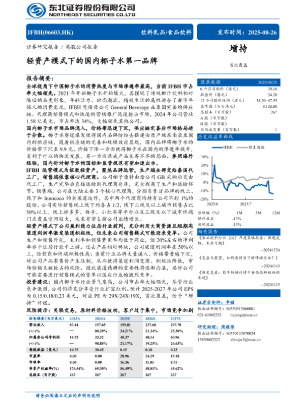 【东北证券】【202508】IFBH(6603.HK)轻资产模式下的国内椰子水第一品牌-30页 证券期货研究报告