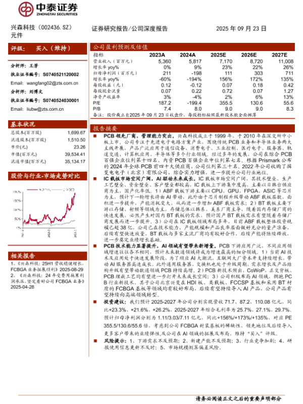 【中泰证券】【202509】兴森科技:IC白板业务引领AI新增长-6页 证券期货研究报告