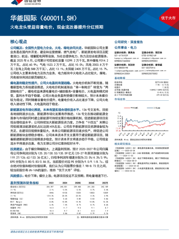【国信证券】【202508】华能国际(600011)火电龙头受益容量电价,现金流改善提升分红预期-50页 证券期货研究报告