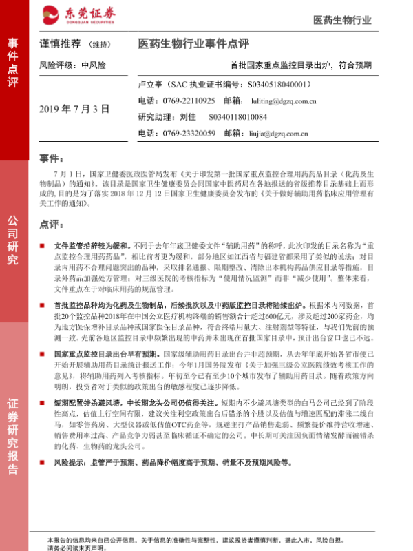 【东莞证券】【20190703】医药生物行业事件点评:首批国家重点监控目录出炉,符合预期-3页 行业研究