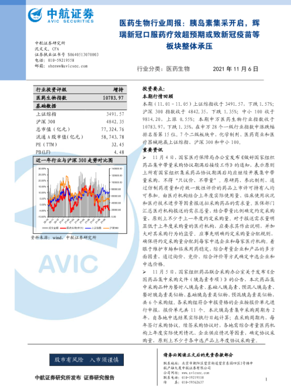 【中航证券】【20211106】医药生物行业周报:胰岛素集采开启,辉瑞新冠口服药疗效超预期或致新冠疫苗等板块整体承压-9页 行业研究