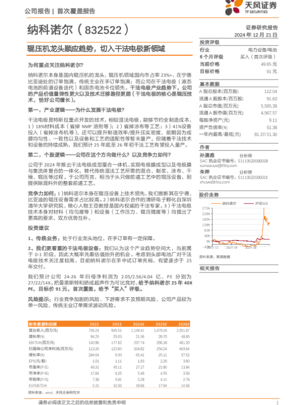 【天风证券】【20241221】纳科诺尔(832522)辊压机龙头顺应趋势,切入干法电极新领域-19页 行业研究