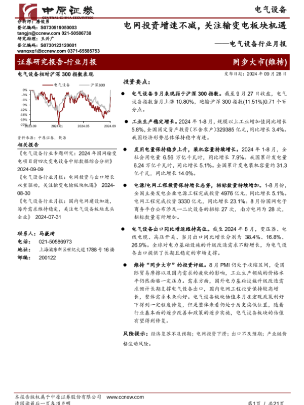 【中原证券】【20240928】电气设备行业月报:电网投资增速不减,关注输变电板块机遇-21页 行业研究