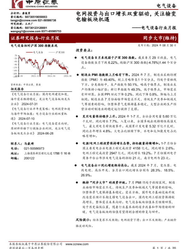 【中原证券】【20240830】电气设备行业月报:电网投资与出口增长双重驱动,关注输变电输板块机遇-20页 行业研究