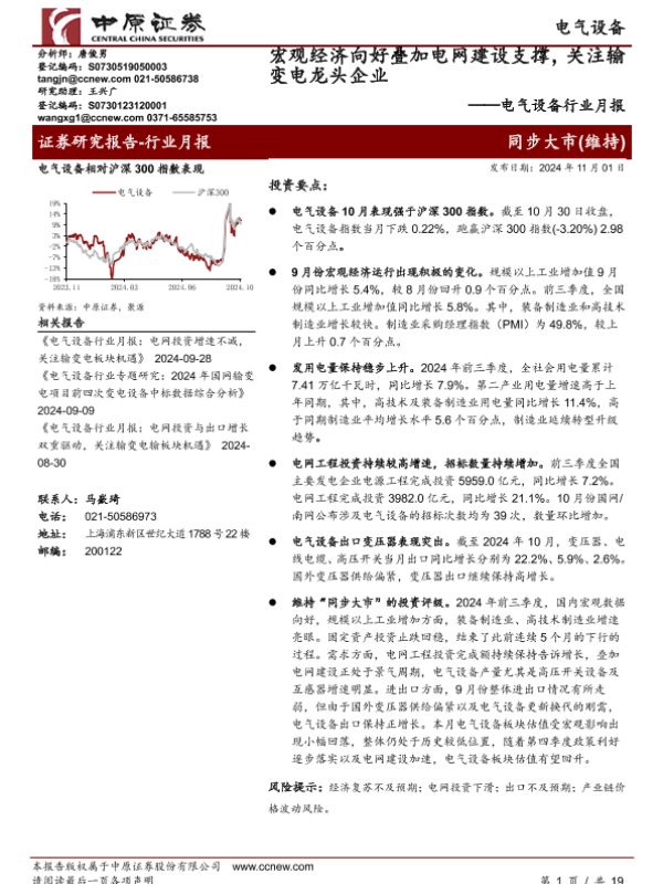 【中原证券】【20241101】电气设备行业月报:宏观经济向好叠加电网建设支撑,关注输变电龙头企业-19页 行业研究