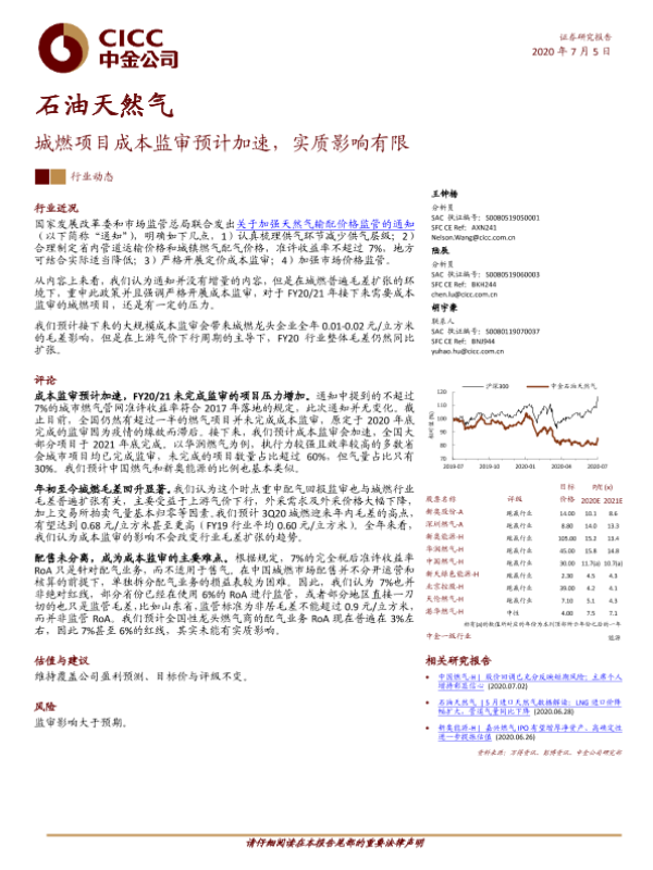 【中金公司】【20200705】石油天然气:城燃项目成本监审预计加速,实质影响有限-5页 行业研究