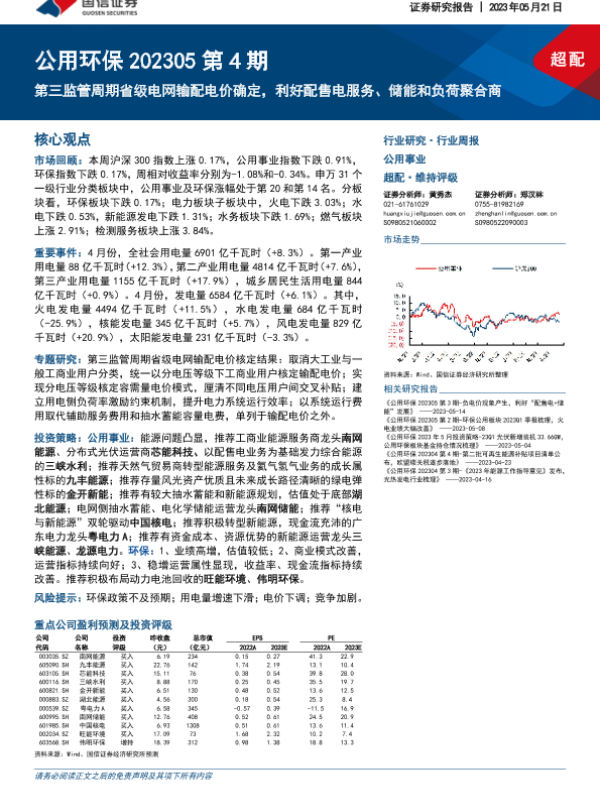 【民生证券】【20230520】公用事业行业周报:输配电价机制理顺,节水减污降碳带动水环境治理-26页 行业研究