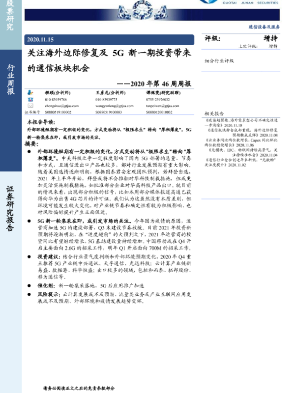 【国泰君安证券】【20201115】2020年第46周周报:关注海外边际修复及5G新一期投资带来的通信板块机会-17页 行业研究