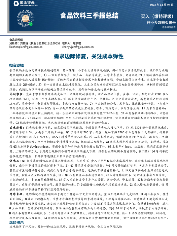 【国金证券】【20231104】食品饮料三季报总结:需求边际修复,关注成本弹性-16页 行业研究