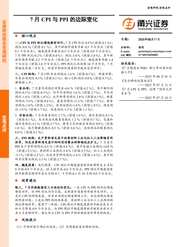 【甬兴证券】【20250811】7月CPI与PPI的边际变化-8页 宏观策略