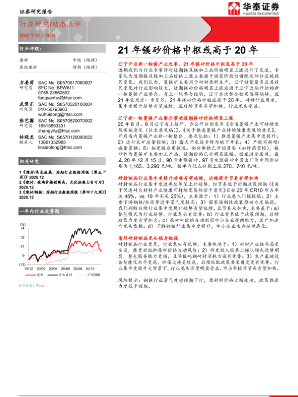 【华泰证券】【20201216】21年镁砂价格中枢或高于20年-5页 行业研究