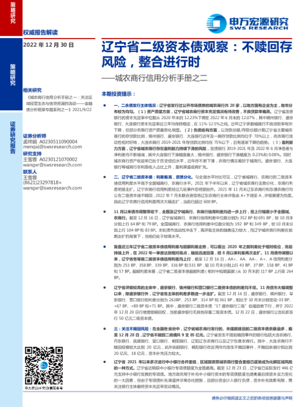 【申万宏源】【20221230】城农商行信用分析手册之二:辽宁省二级资本债观察,不赎回存风险,整合进行时-22页 行业研究