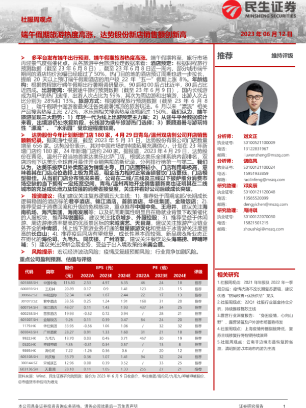 【民生证券】【20230612】社服周观点:端午假期旅游热度高涨,达势股份新店销售额创新高-21页 行业研究