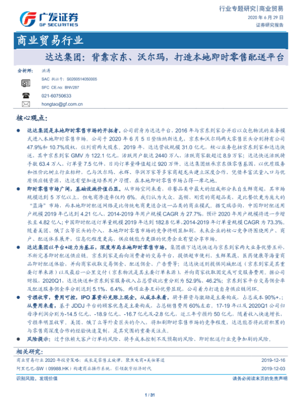 【广发证券】【20200629】达达集团:背靠京东、沃尔玛,打造本地即时零售配送平台-31页 行业研究