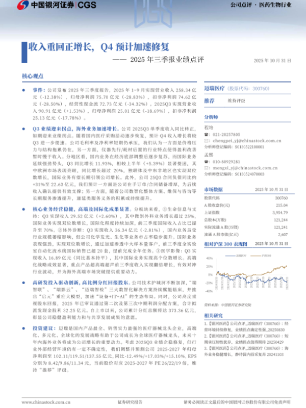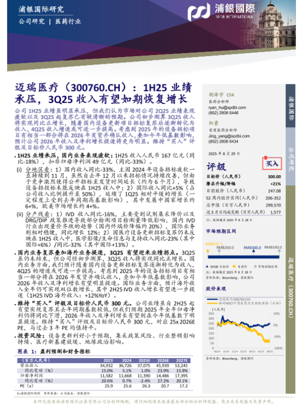 【浦银国际】【20250829】迈瑞医疗-1H25业绩承压-3Q25收入有望如期恢复增长-7页 证券期货研究报告