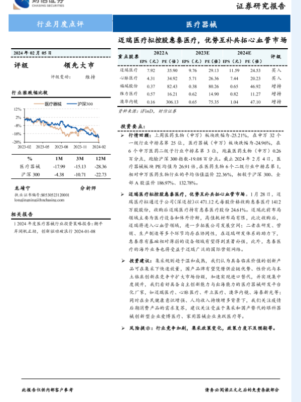 【财信证券】【20240205】医疗器械行业月度点评:迈瑞医疗拟控股惠泰医疗,优势互补共拓心血管市场-12页 行业研究
