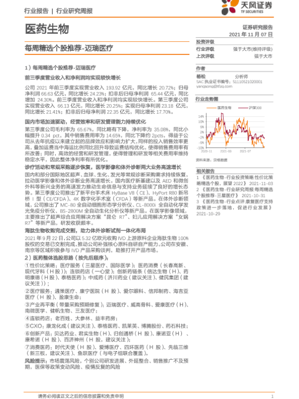 【天风证券】【20211107】每周精选个股推荐-迈瑞医疗-4页 行业研究