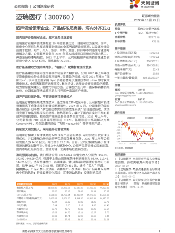 【天风证券】【20221025】迈瑞医疗-300760.SZ-超声领域领军企业,产品线布局完善,海内外齐发力-26页 行业研究