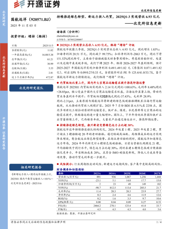 【开源证券】【202511】持续推进绿色转型、新运力投入内贸,2025Q1-3实现营收6.93亿元-4页 证券期货研究报告