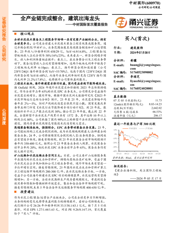 【甬兴证券】【20240708】中材国际首次覆盖报告:全产业链完成整合,建筑出海龙头-24页 行业研究
