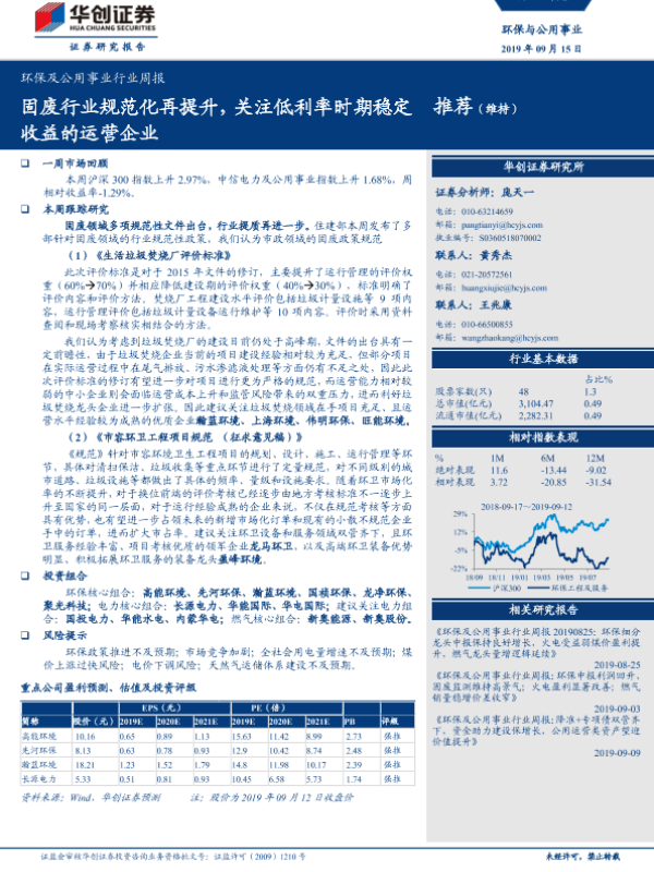 【华创证券】【20190915】环保及公用事业行业周报:固废行业规范化再提升,关注低利率时期稳定收益的运营企业-26页 行业研究