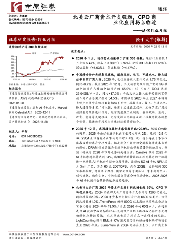 【中原证券】【202602】通信行业月报:北美云厂商资本开支强劲,CPO商业化应用拐点临近-46页 证券期货研究报告