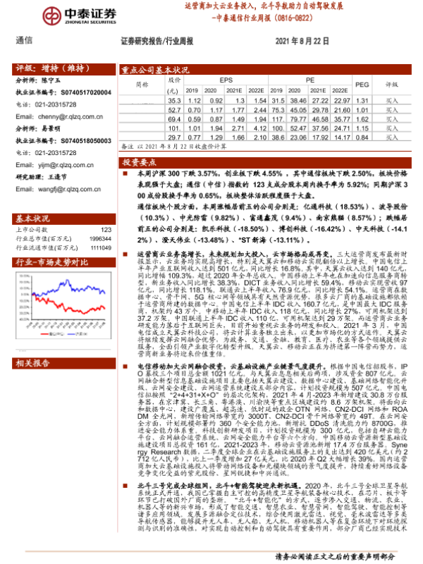 【中泰证券】【20210822】中泰通信行业周报:运营商加大云业务投入,北斗导航助力自动驾驶发展-15页 行业研究