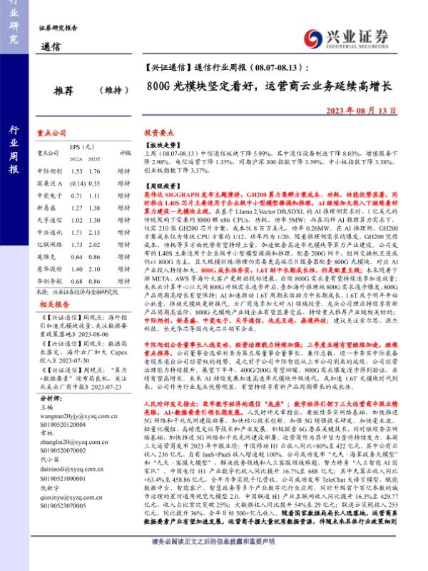 【兴业证券】【20230813】通信行业周报:800G光模块坚定看好,运营商云业务延续高增长-21页 行业研究