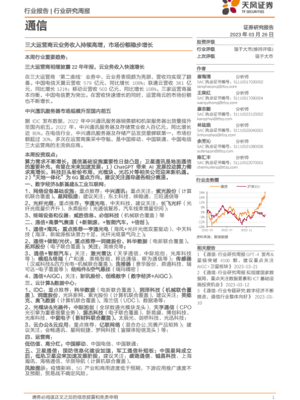 【天风证券】【20230326】通信行业研究周报:三大运营商云业务收入持续高增,市场份额稳步增长-13页 行业研究