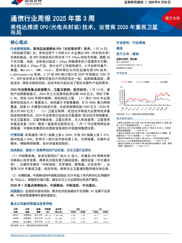 【国信证券】【20250120】通信行业周报2025年第3周:英伟达推进CPO(光电共封装)技术,运营商2025年重视卫星布局-19页 行业研究