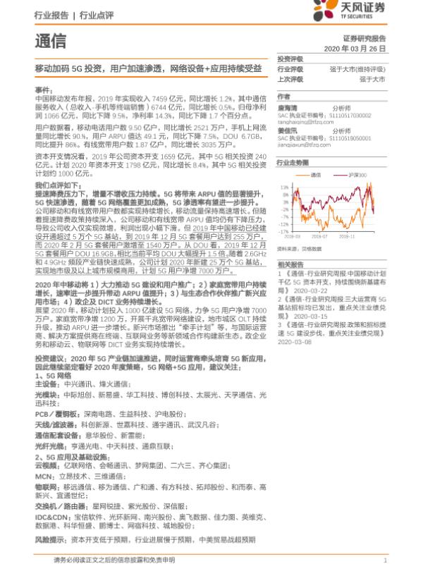 【天风证券】【20200326】通信:移动加码5G投资,用户加速渗透,网络设备+应用持续受益-9页 行业研究