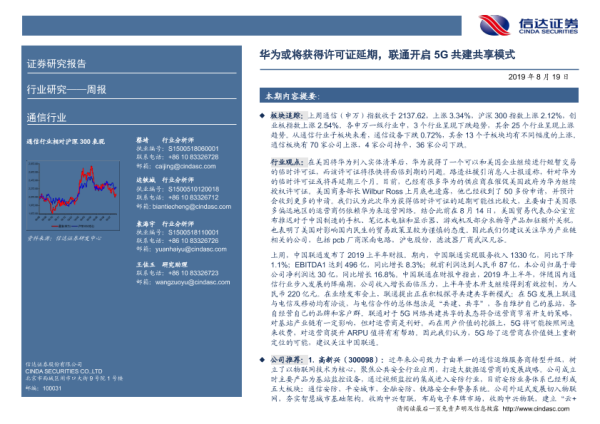 【信达证券】【20190819】20190819-信达证券-通信行业周报:华为或将获得许可证延期,联通开启5G共建共享模式-14页 行业研究