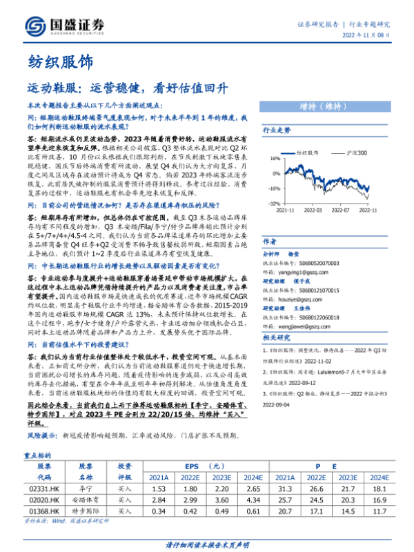 【国盛证券】【20221108】纺织服饰:运动鞋服:运营稳健,看好估值回升-16页 行业研究