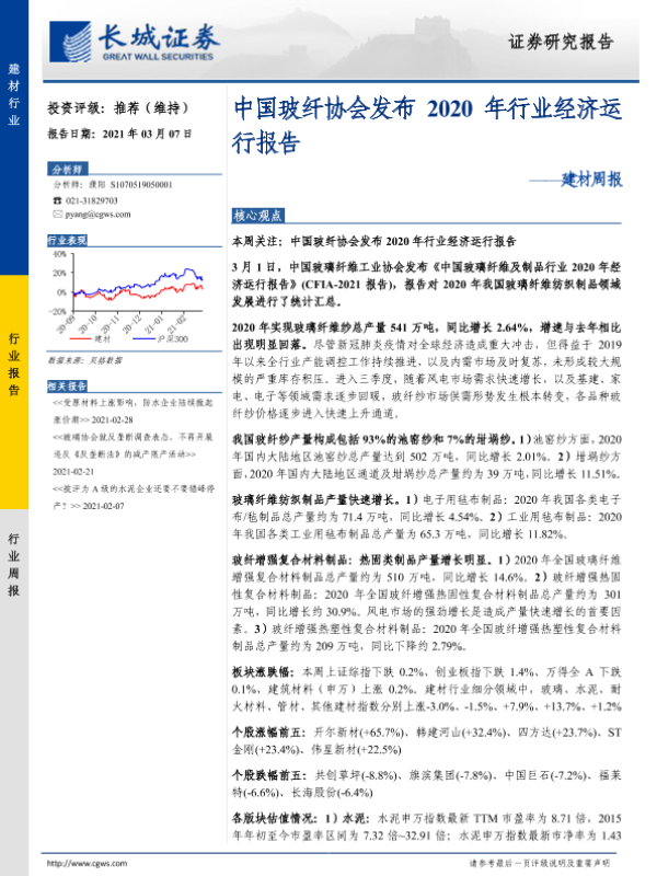 【长城证券】【20210307】中国玻纤协会发布2020年行业经济运行报告-21页 行业研究