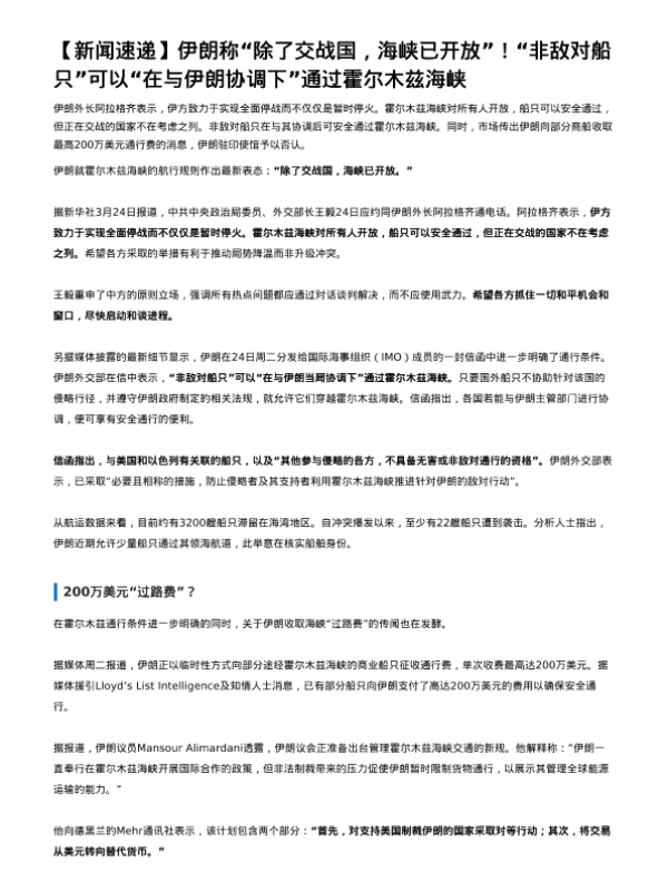【英大期货】【202603】伊朗称除了交战国,海峡已开放,非敌对船只可以,在与伊朗协调下通过霍尔木兹海峡-2页 证券期货研究报告
