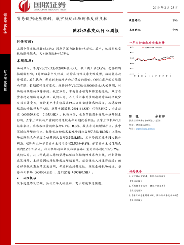 【国联证券】【20190225】交运行业周报:贸易谈判进展顺利,航空航运板块迎来反弹良机-10页 行业研究