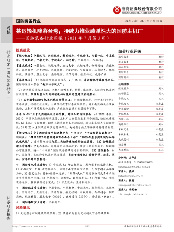 【浙商证券】【20210718】20210718-浙商证券-国防装备行业周报:某运输机降落台湾;持续力推业绩弹性大的国防主机厂-13页 行业研究