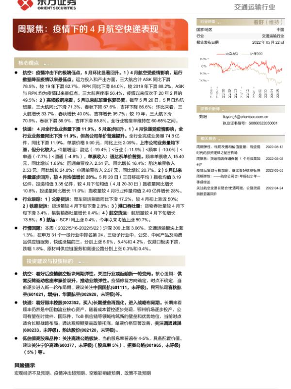 【国泰君安证券】【20220519】航空客流恢复持续,产成品运价高位回落-10页 行业研究