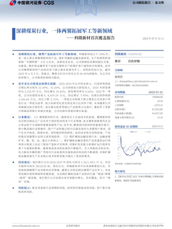 【中国银河证券(CGS)】【20250731】科隆新材-深耕煤炭行业,一体两翼拓展军工等新领域-20页 证券期货研究报告