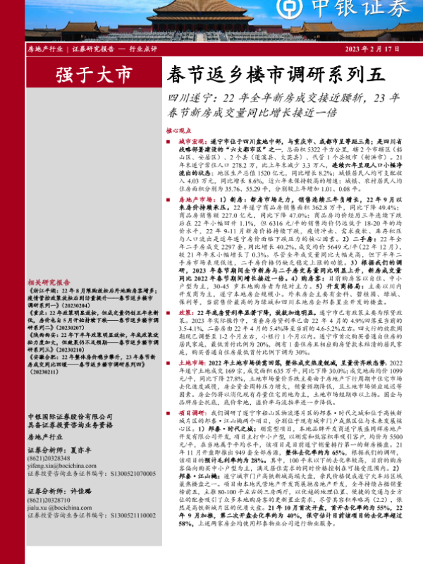 【中银证券】【20230217】房地产行业春节返乡楼市调研系列五:四川遂宁,22年全年新房成交接近腰斩,23年春节新房成交量同比增长接近一倍-25页 行业研究