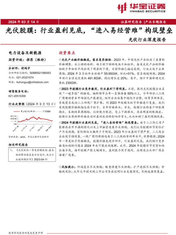 【华宝证券】【20240315】2024-03-15-光伏行业深度报告-光伏胶膜-行业盈利见底-“进入易经营难”构筑壁垒-14页 行业研究