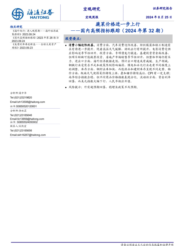 【海通证券】【20240825】国内高频指标跟踪(2024年第32期):蔬菜价格进一步上行-12页 行业研究