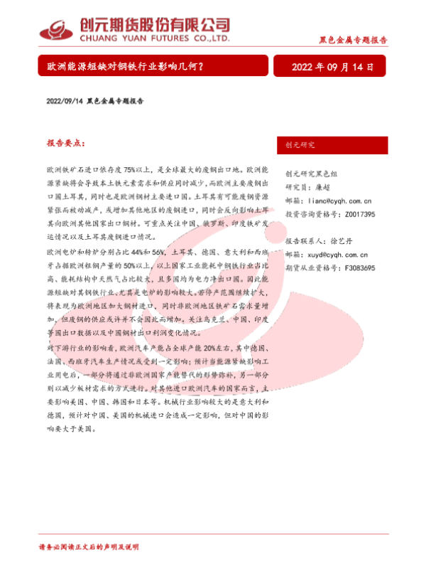 【创元期货】【20220914】黑色金属专题报告:欧洲能源短缺对钢铁行业影响几何?-26页 行业研究