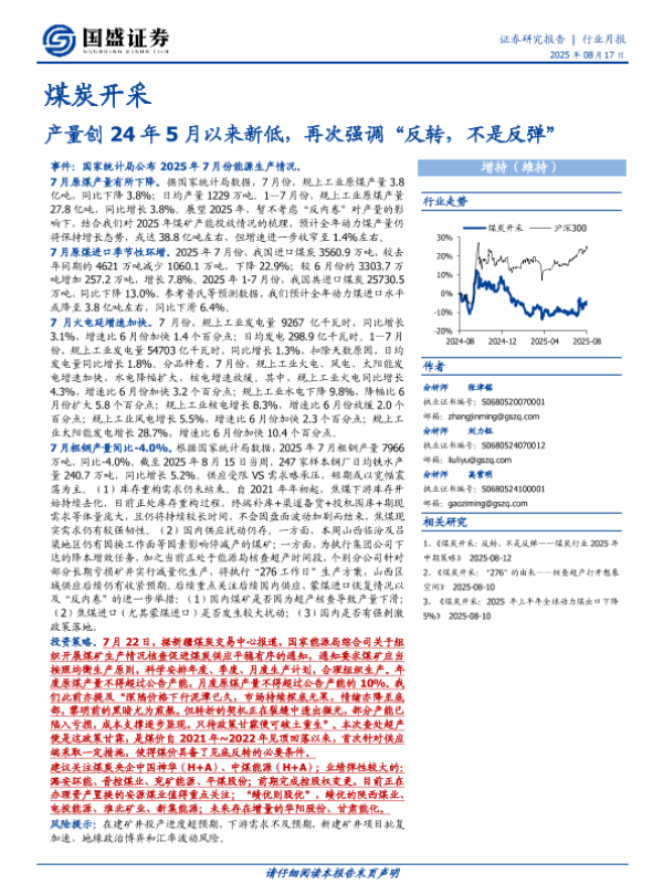 【国盛证券】【20250817】煤炭开采行业月报-产量创24年5月以来新低,再次强调“反转,不是反弹”-10页 证券期货研究报告