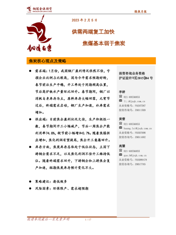 【铜冠金源期货】【20230205】煤焦月报:供需两端复工加快,焦煤基本弱于焦炭-17页 行业研究
