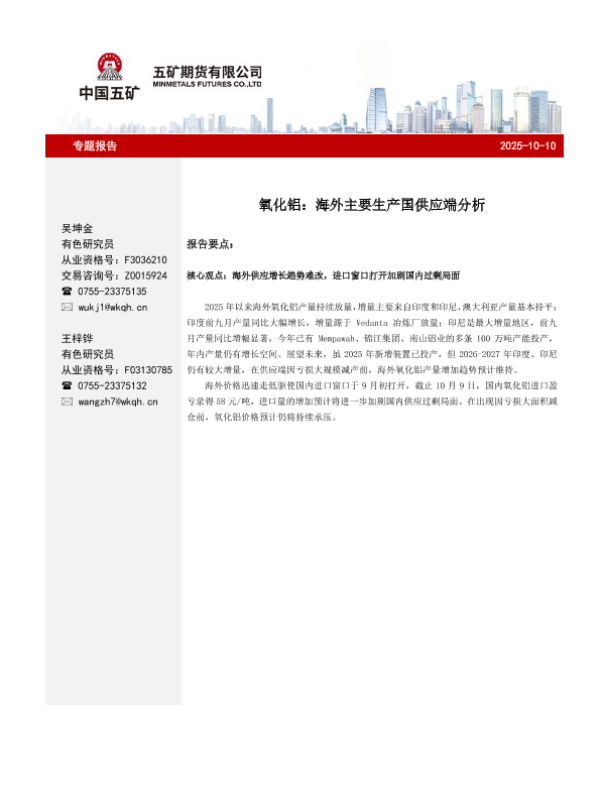 【五矿期货】【202510】氧化铝:海外主要生产国供应端分析-5页 证券期货研究报告