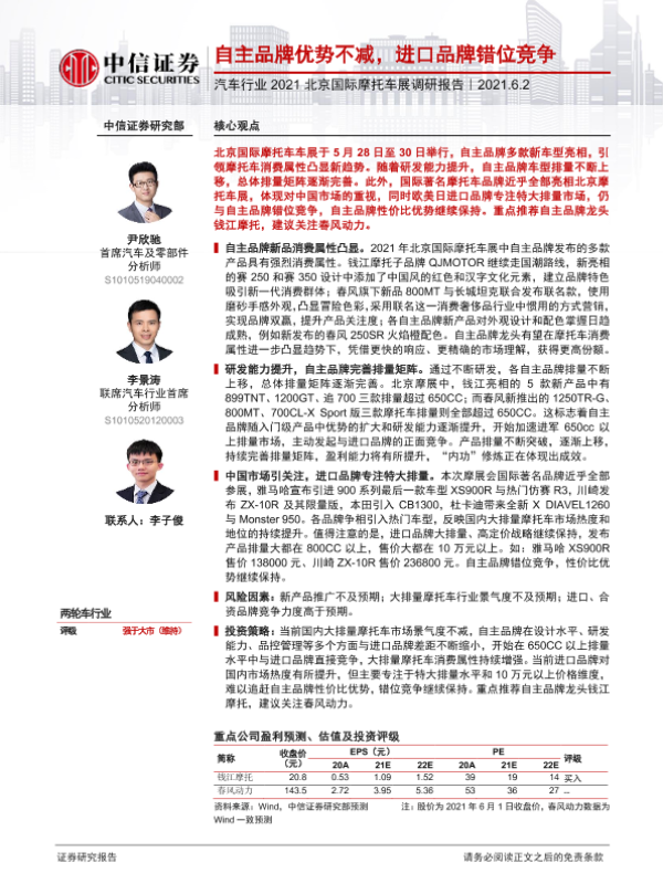 【中信证券】【20210602】汽车行业2021北京国际摩托车展调研报告:自主品牌优势不减,进口品牌错位竞争-11页 行业研究