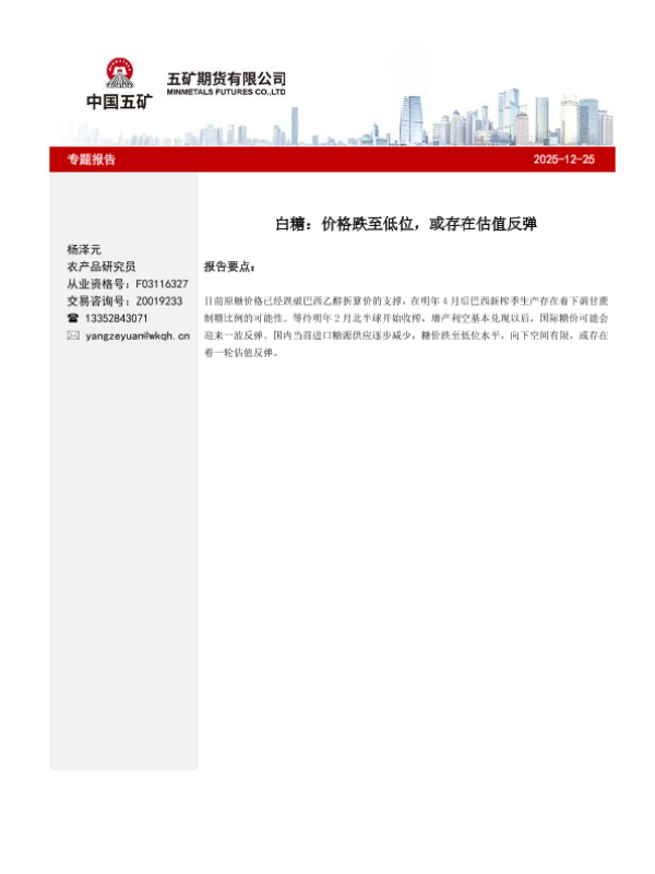 【五矿期货】【202512】白糖:价格跌至低位,或存在估值反弹-5页 证券期货研究报告