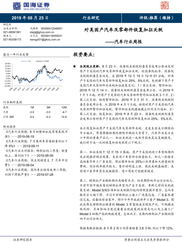 【国海证券】【20190825】20190825-国海证券-汽车行业周报:对美国产汽车及零部件恢复加征关税-17页 行业研究