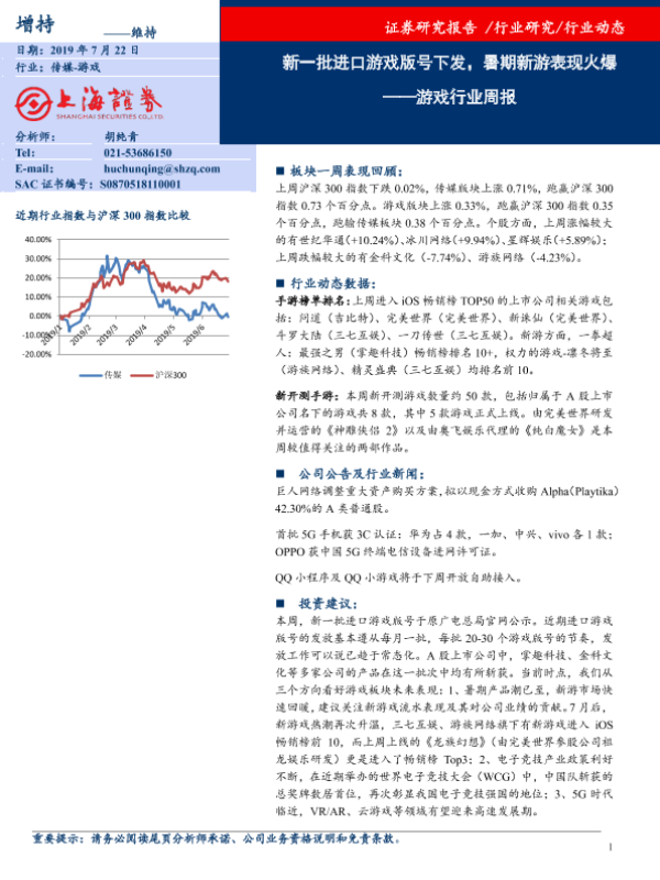【上海证券】【20190722】游戏行业周报:新一批进口游戏版号下发,暑期新游表现火爆-8页 行业研究